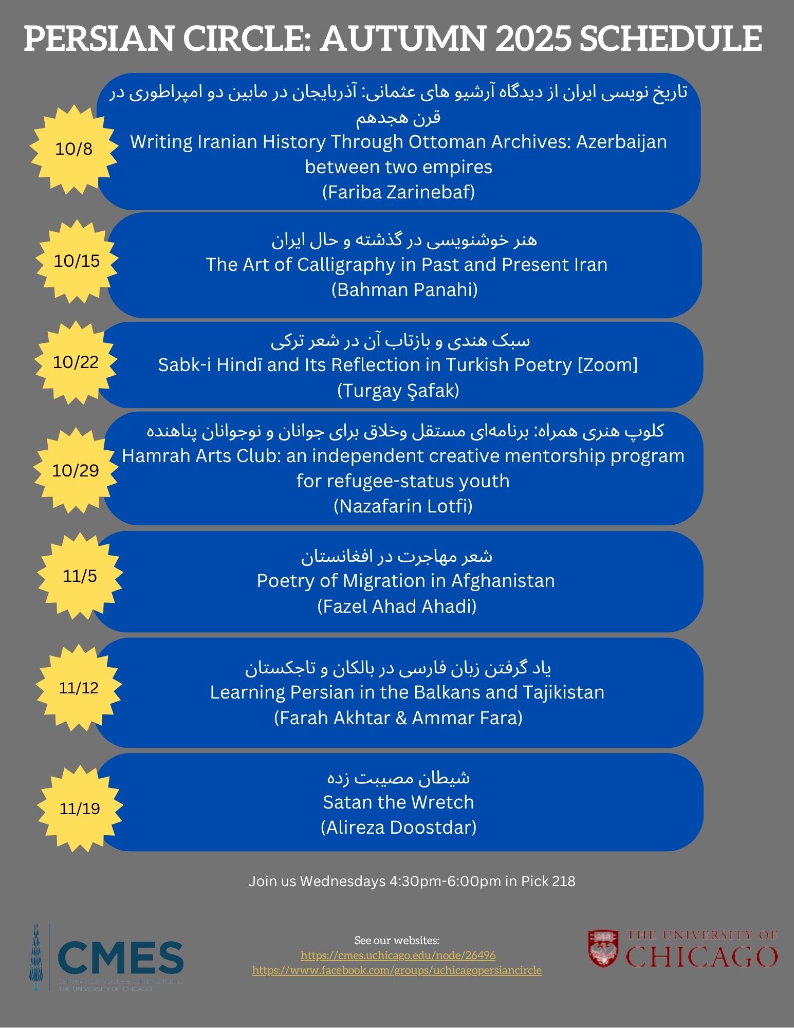 The Persian Circle (Anjoman-e sokhan) is a weekly lecture series in Persian at the University of Chicago’s Center for Middle Eastern Studies. The lectures include social, cultural and academic discussions about the Persian-speaking world and is led by faculty, students, and visiting scholars and artists. The opinions of the speakers are their own.